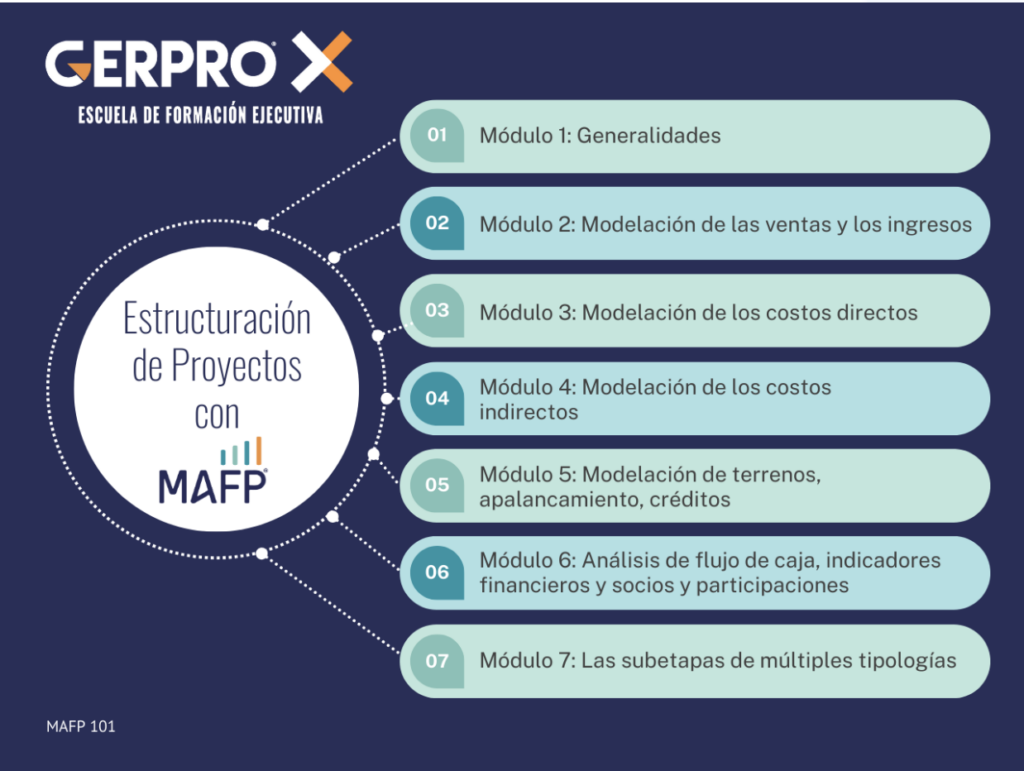 En este programa aprenderá a estructurar y desarrollar modelos financieros en MAFP para evaluación de terrenos, negocios inmobiliarios, salida a venta ó cualquier momento en el desarrollo del proyecto en diferentes usos y para diferentes tamaños y alcances.
